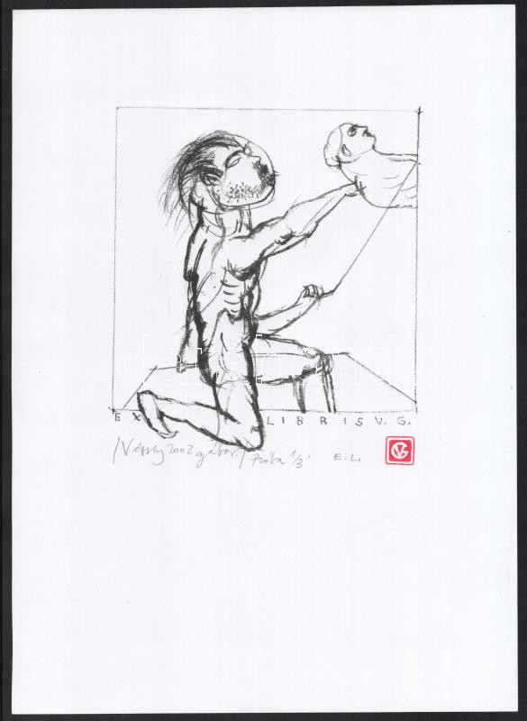 Véssey Gábor (1948-): Ex libris V.G., 2002. Litográfia, papír, jelzett, próbanyomat 1/3 számozással, 17×15 cm