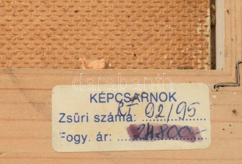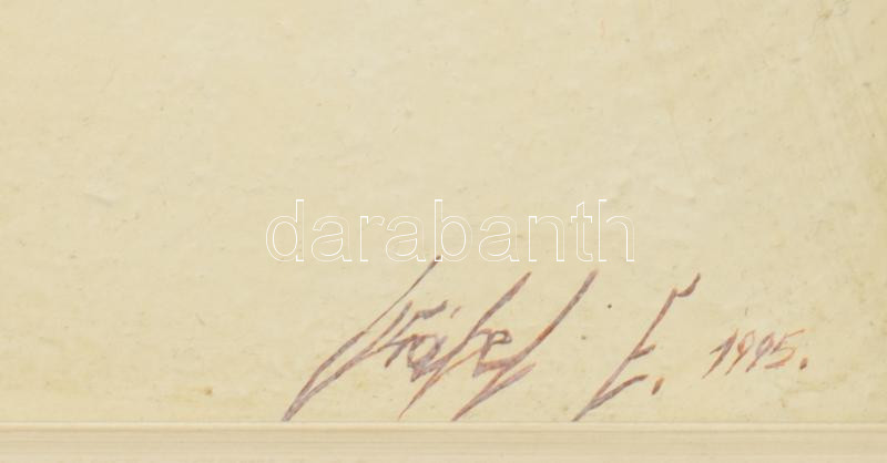 Description: Wrábel Erzsébet (1959-): Szárnyalás, 1995. Vegyes technika, applikáció, farost. Jelezve jobbra lent. Hátoldalán autográf felirattal, a művész bélyegzésével és Képcsarnok Vállalat címkéjével. Dekoratív fakeretben. 35x42 cm