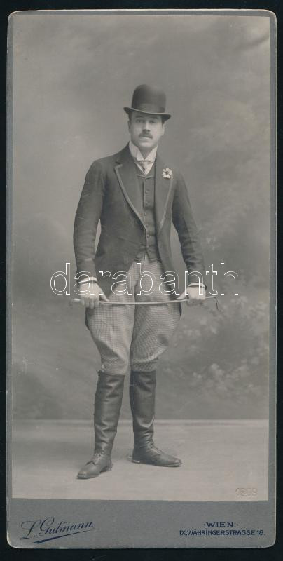 1909 Elegáns úr lovaglópálcával, sarkantyús csizmával, kabinetfotó L. Gutmann bécsi műterméből, 21,5x11 cm