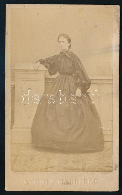 cca 1870 Hölgy (Kowach Apollonia) egészalakos portréja, vizitkártya Angelo Gabrielo műterméből, a hátoldalon feliratozva, 10x6 cm