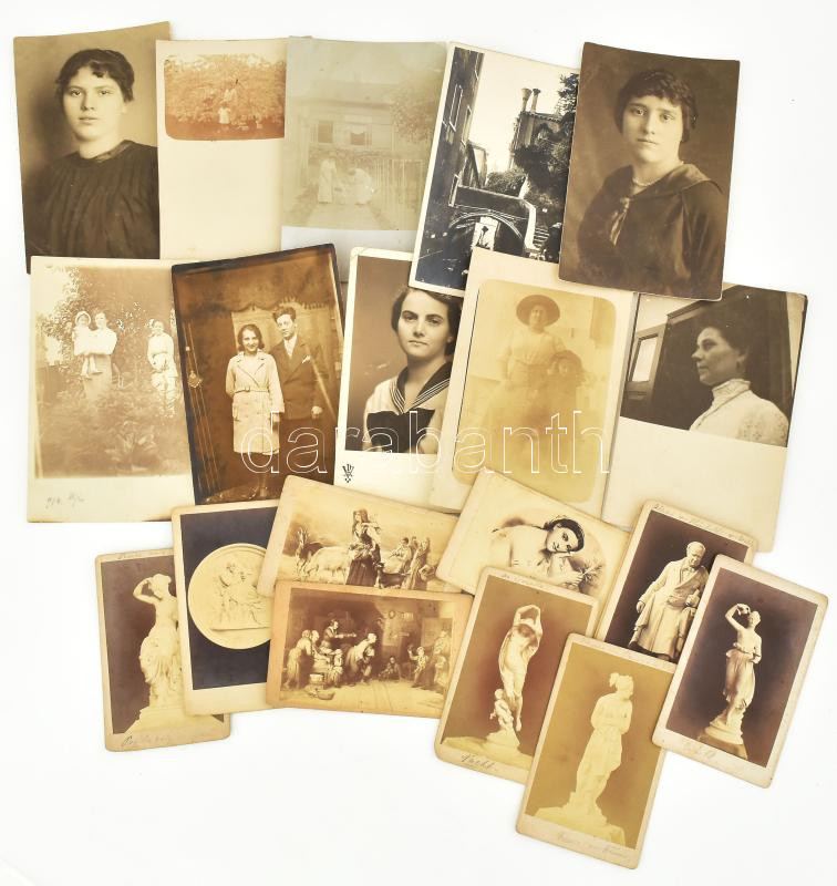 Description: cca 1880-1940 össz. 21 db vegyes fotó és fotólap tétel: 10 db keményhátú reprodukciós fotó szobor és festmény témában, közte Canova Vénusz, 1800-1890 k., 10x6 cm k. méretben + 11 db fotólap, többségében portré, egy velencei részlet, 14x9 cm