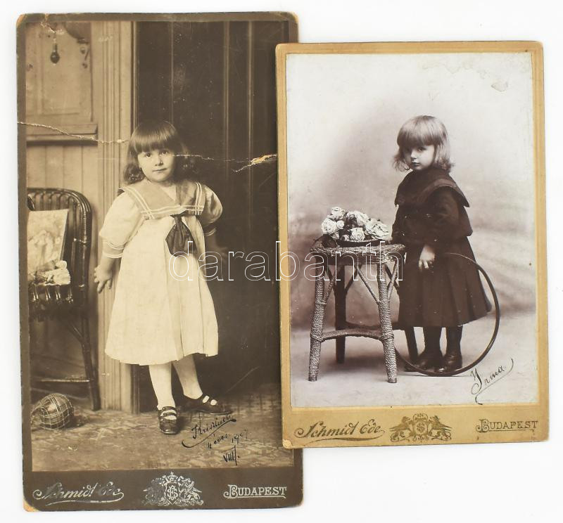 Description: cca 1896-1907 Irma n. kislány karika játékkal és Krisztina n. kislány labdával, 2 db keményhátú fotó Schmidt Ede budapesti műterméből, kissé kopott, egyik sérült, 16,5x11 és 20,5x11 cm