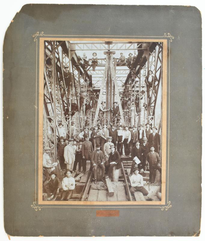 cca 1900 Trencsén, Felvidék, Vág folyó feletti híd építésén résztvevő munkások csoportképe, kartonra kasírozott fotó, sérült karton, 26,5×19,5 cm