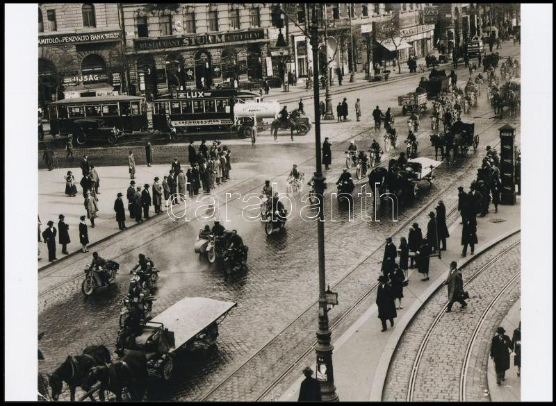 cca 1925 Munkácsi Márton (1896-1963) magyar - amerikai fotóriporter és fotóművész felvétele (Motorversenyzők felvonulása Budapesten), a néhai Lapkiadó Vállalat központi fotólaborjának archívumából 1 db modern nagyítás, jelzés nélkül, (a képen látható még lovaskocsi, locsolóautó, villamos, forgalomirányító rendőr, lovasrendőr is, talán a Móricz Zsigmond körtérnél???), 15x21 cm