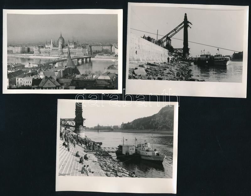 cca 1946-1960 Bp., Duna-part, hajó előtt várakozó emberek a romos Erzsébet-hídnál, valamint a Parlament a Kossuth híddal, 3 db fotó, 12x9 cm körül