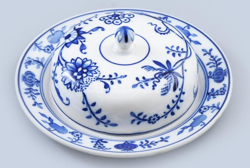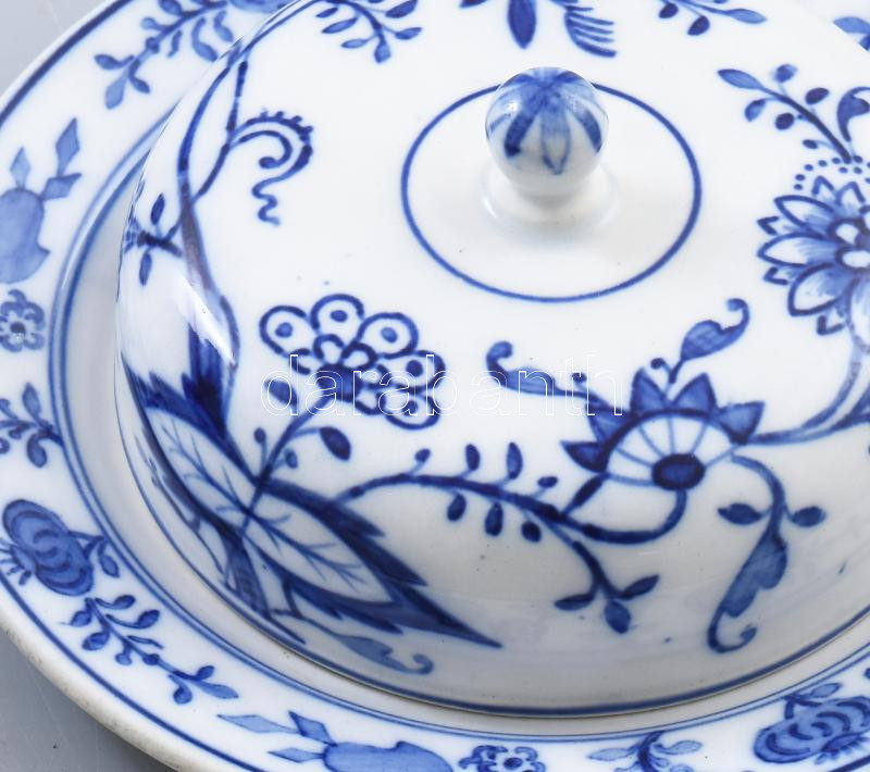 1879-1909 Villeroy & Boch "Dresden blue" hagymamintás vajtartó. Máz alatti kobalt festéssel, jelzett: "Mercury" pecsét, kopással, fedél peremén kis lepattanással, d: 15,5 cm