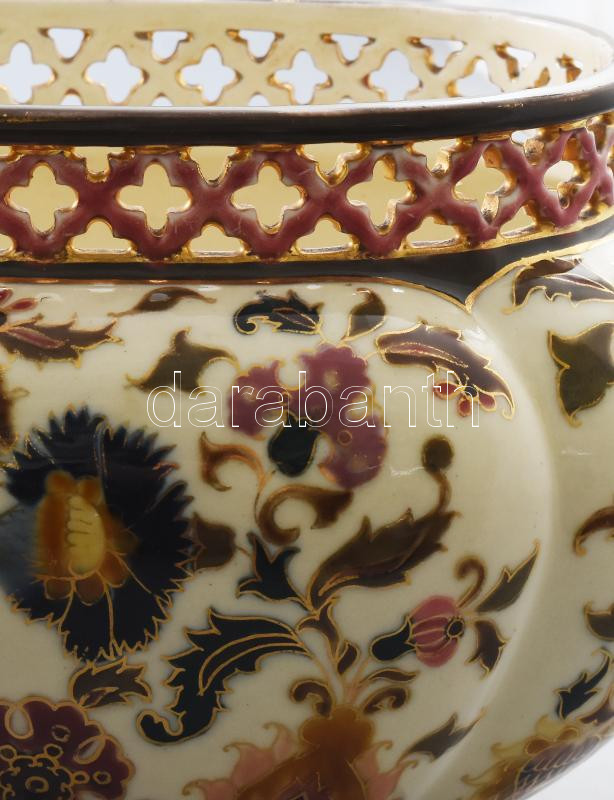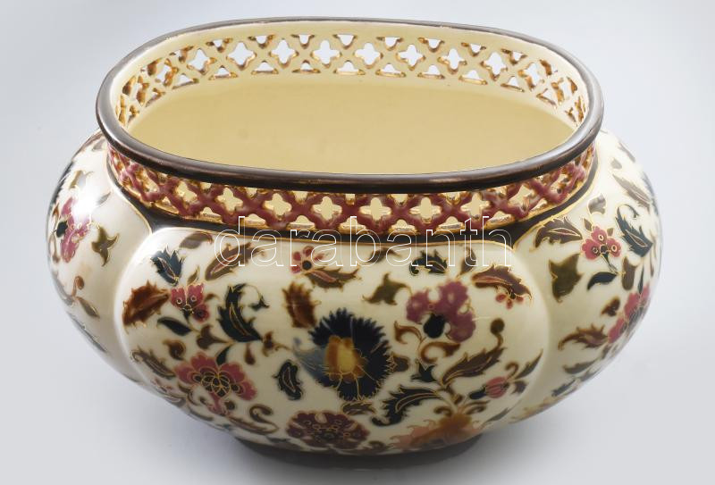 1883 körül, Zsolnay jardiniere. Magastüzű mázakkal fedett finomfajansz. Gerezdelt testű, pereme ismétlődő áttört minta. Jelzett: alján kobaltkék családi pecsét. Minimális kopással, 23,5x17x14,5 cm