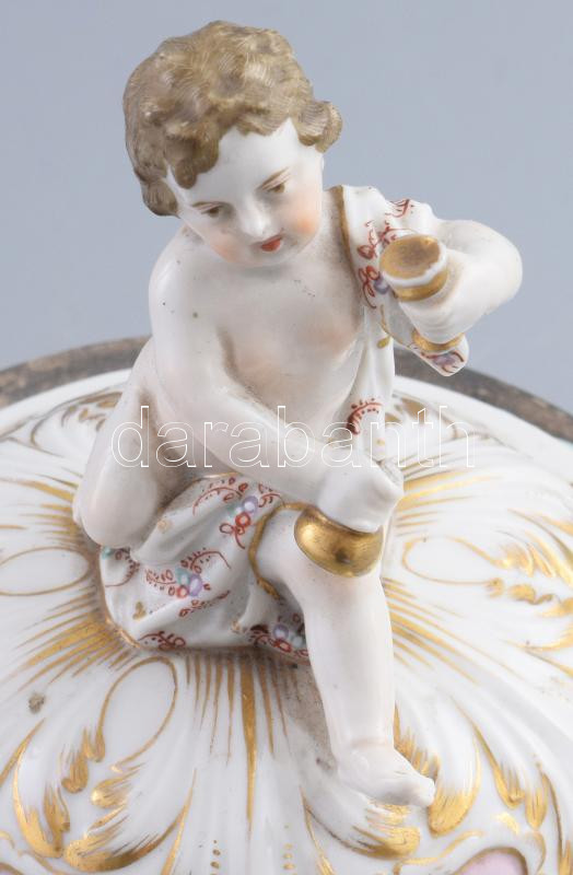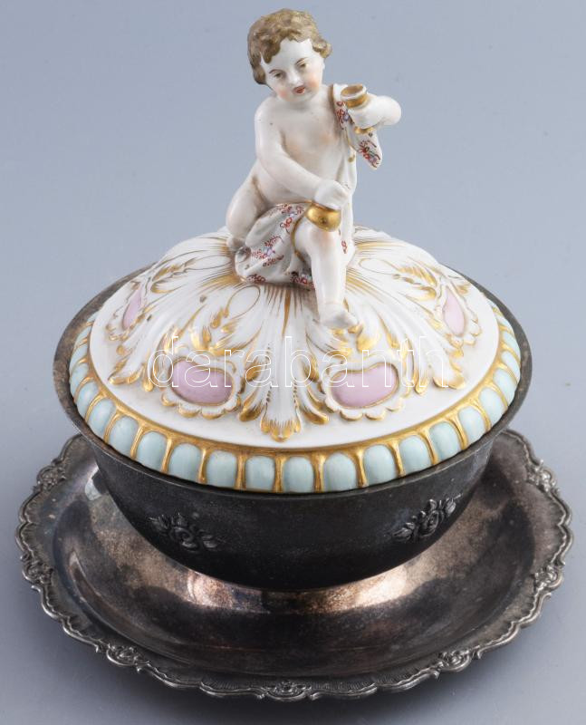 Antik ezüstözött cukortartó figurális porcelán fedővel, sérült, m: 19,5 cm