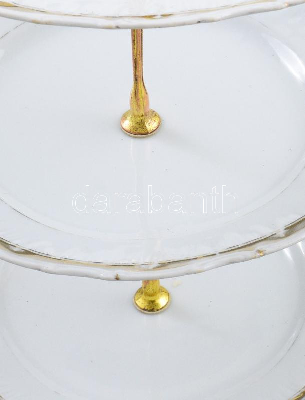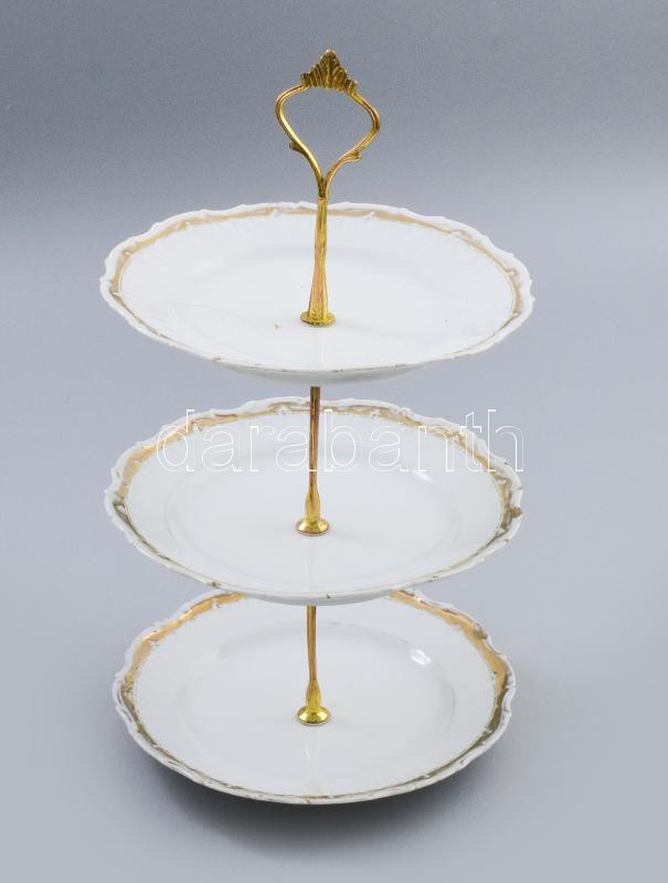 Antik háromemeletes süteménykínáló, fém szerelékkel, egyik tányéron jelzett, kopással, kissé ferde, d: 19 cm, m: 33,5 cm