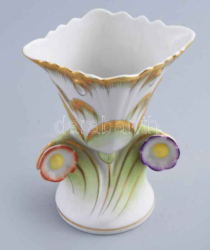 Herendi Viktória mintás váza, plasztikus virágdíszítéssel, jelzett, egyik virágon lepattanással m: 12,5 cm