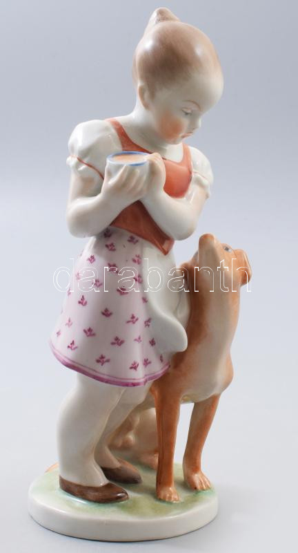 Herendi lány ételt kuncsorgó kutyával. Jelzett, kézzel festett, hibátlan (alátámasztási nyommal), m: 21,5 cm