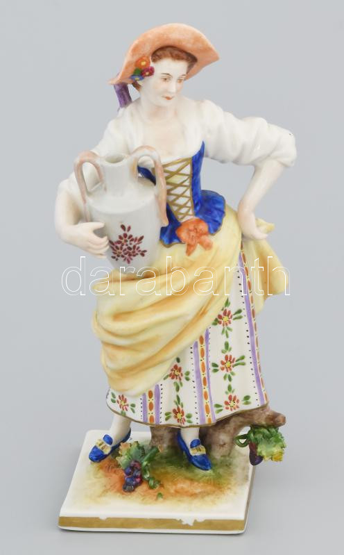 Rudolf Kammer porcelán borász hölgy figura, jelzett, kopással, m: 15,5 cm