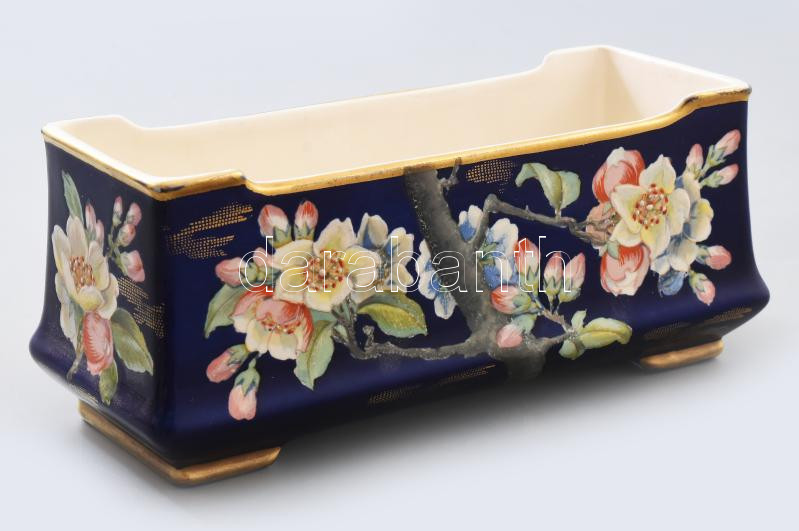 Villeroy & Boch Taiping jugendstil jardiniere. Kézzel festett polikróm mázakkal fedett finomfajansz, cca 1900. Jelzett, kopással, repedt mázzal, minimális ütődésnyommal, 21x8,5x8,5 cm