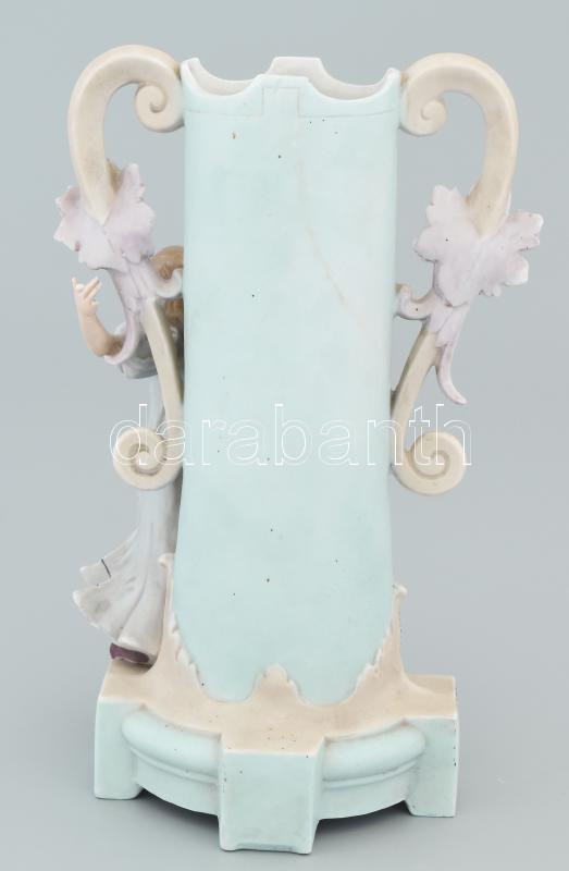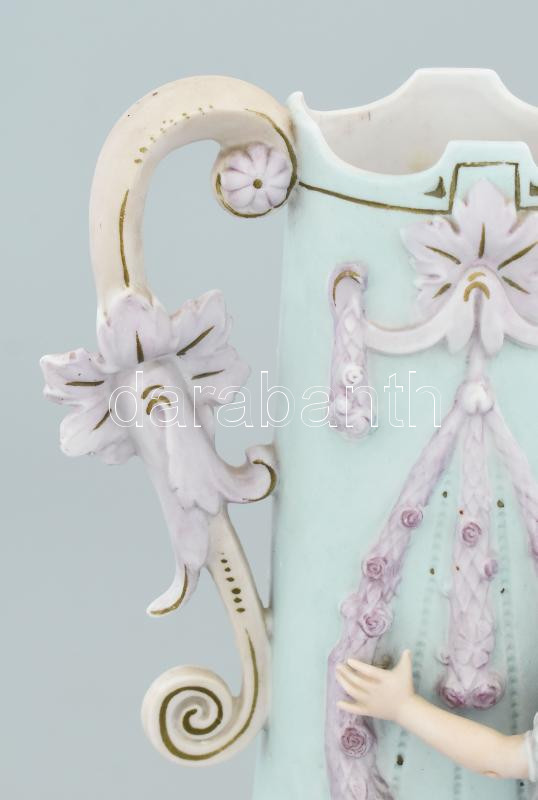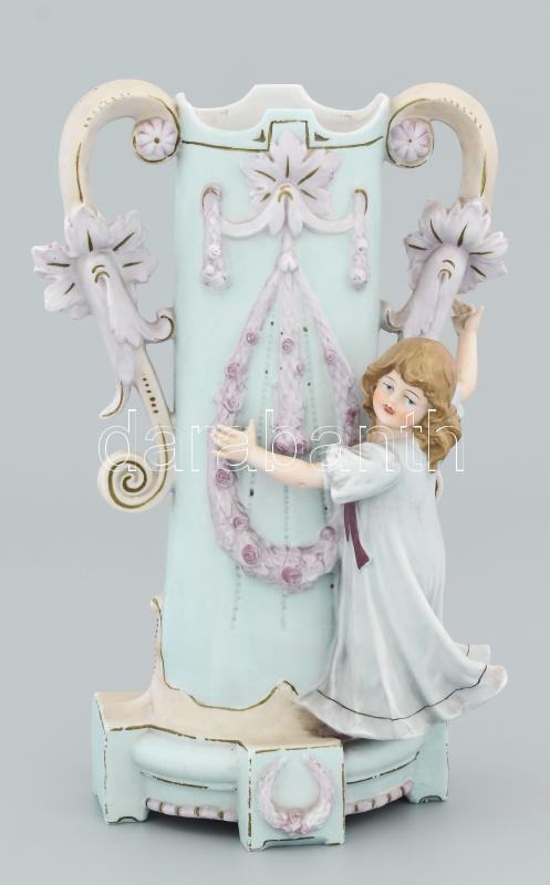 cca 1900, Art nouveau váza, kapaszkodó kislány alakjával. Festett biszkvit porcelán, plasztikus növényi ornamentikával dÃszÃtett fülekkel, vázatesten virágkoszorú elemekkel. Talpazaton álló kapaszkodó kislány alak egyik kezén sérült ujjak. Restaurált. Jelzett, m: 23,5 cm