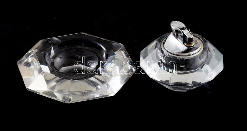 Fazettált kristály hamutálca és öngyújtó, d: 13 cm alatt