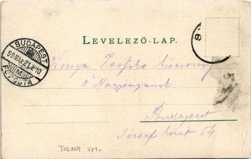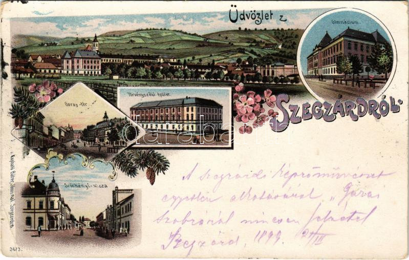 1899 (Vorläufer) Szekszárd, Szegzárd; gimnázium, Garay tér, Törvényszék, Széchenyi utca. Báter János Art Nouveau, floral, litho (EK)