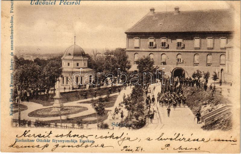 1900 Pécs, Sétatér, katonai zenekar. Rechnitzer Ottokár fénynyomdája, Fischer Ferenc kiadása