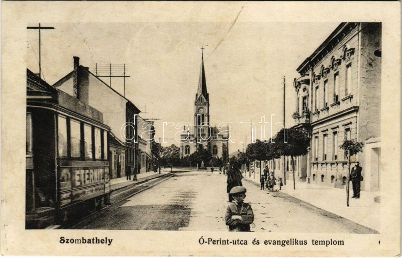 1915 Szombathely, Ó-Perint utca, evangélikus templom, villamos Eternit...