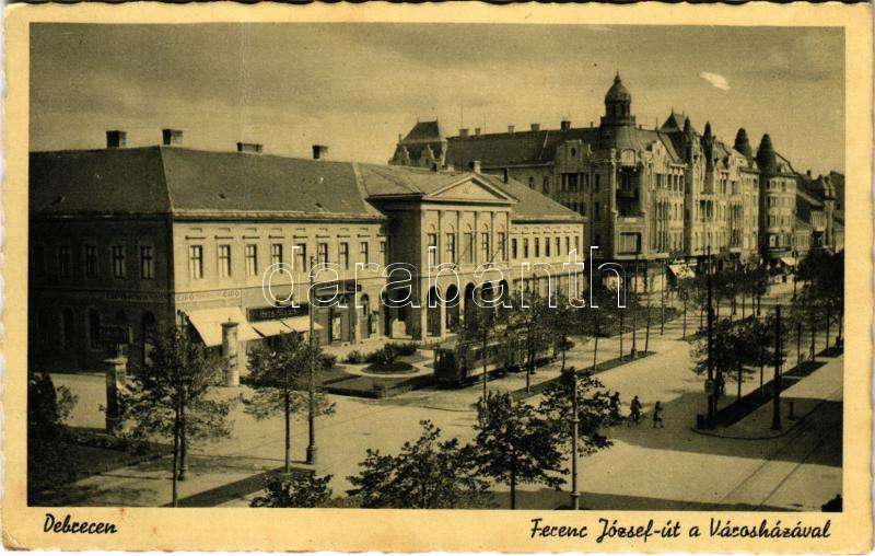 1944 Debrecen, Ferenc József út, Városháza, villamos, Kontsek Kornél, Tóth Gyula és cipős üzlet (fa)
