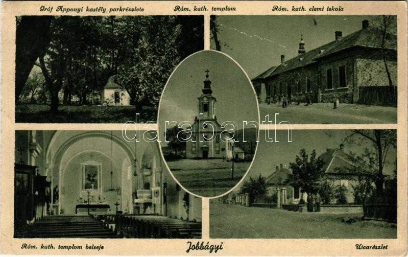 1944 Jobbágyi (Nógrád), Római katolikus templom és belseje és elemi iskola, utca, Gróf Apponyi kastély parkja. Homolya Hános kiadása (EK)