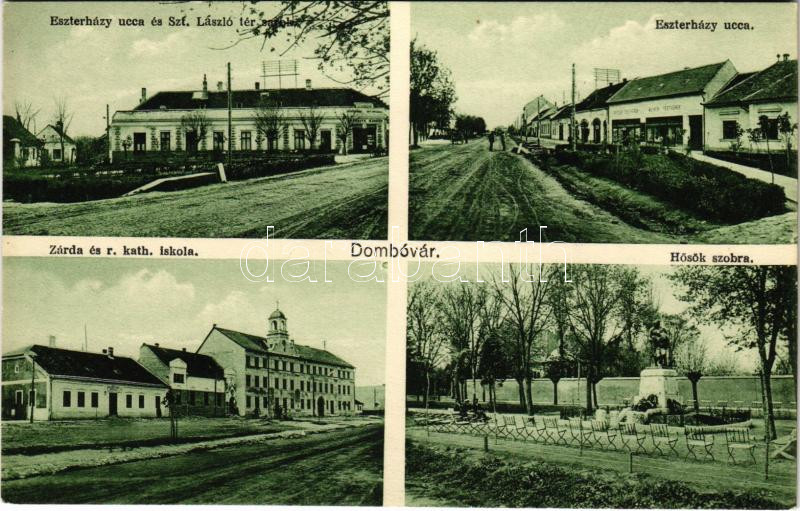 Dombóvár, Zárda és római katolikus iskola, Eszterházy utca, Szent László tér, Hősök szobra, Spitzer és Weiner Testvérek üzlete