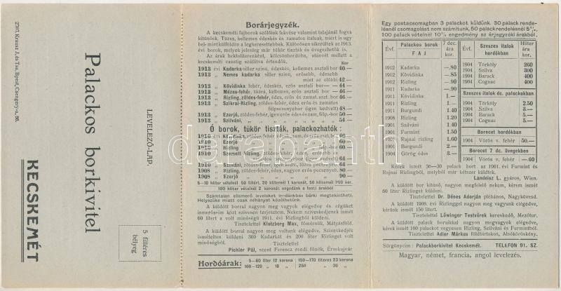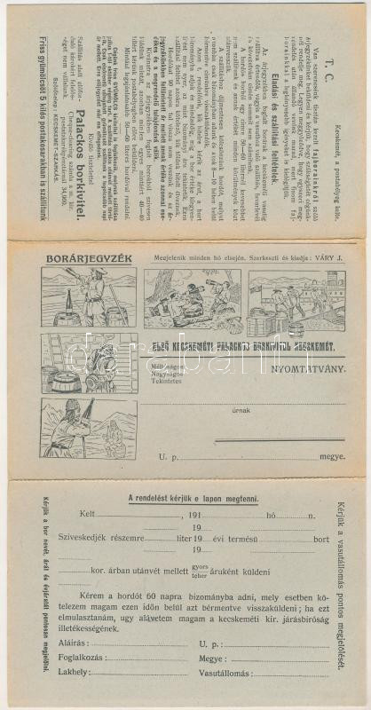 Description: Kecskemét, Első Kecskeméti Palackos Borkivitel. Borárjegyzék, megjelenik minden hó elsején. Szerkeszti és kiadja Váry J. kihajtható 3-részes levelezőlap