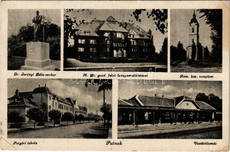 Putnok, Polgári iskola, Gróf Serényi Béla szobor, M. kir. gazdasági felső leánynevelőintézet, római katolikus templom, vasútállomás (EK)
