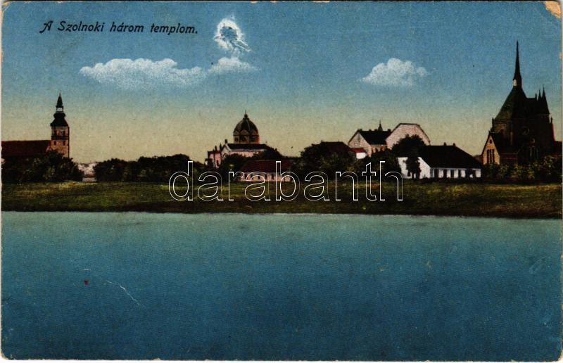 Szolnok, három templom, zsinagóga. Gettler József kiadása (EK)