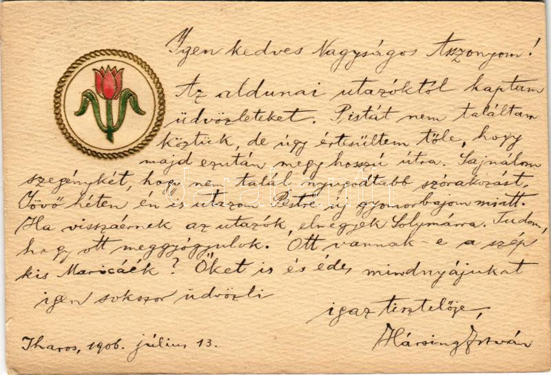 Description: 1906 Országos Tulipánkert Szövetség reklámlapja. A "Tulipános Iparvédő Mozgalom" Egykoronás jelvényével. Honi Ipar kiadása / Hungarian National Tulip Garden Association, Tulip movement, propaganda. Emb.
