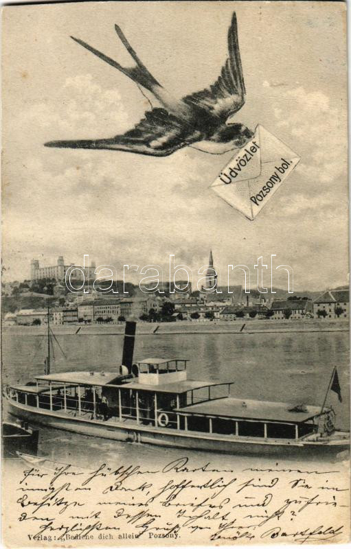 1905 Pozsony, Pressburg, Bratislava; Dunai ingahajó és vár. Fecskés üd... https://www.darabanth.com/en/472-Online-auction/472.0/Postcards/Slovakia~1500008/1905-Pozsony-Pressburg-Bratislava-Dunai-ingahajo-es-var-Fecskes-udvozlet-Bediene-dich-all~II3197763