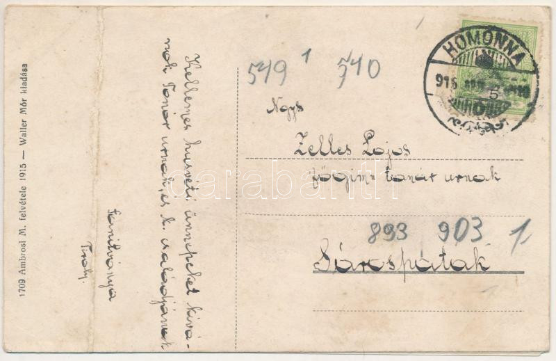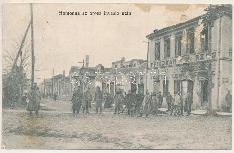 1916 Homonna, Homenau, Humenné; Fő tér romokban az oroszok betörése után, Friedmann Markus üzlete, az orosz invasio után. Waller Mór kiadása, Ambrosi M. felvétele / WWI destroyed main square after the Russian offensive, shops, ruins (ázott, három részre szétvált / divided into three parts by wet damage)