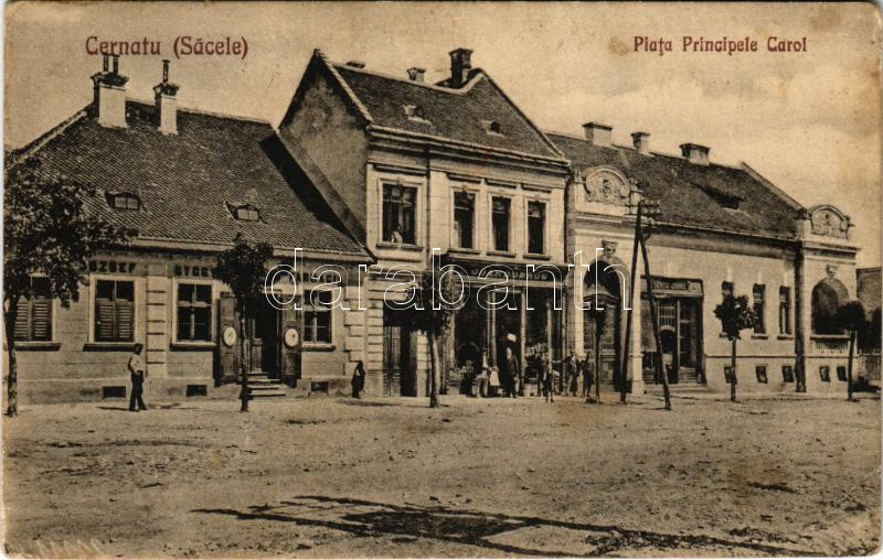 Csernátfalu, Cernat, Cernatul (Négyfalu, Sacele); Piata Principele Carol, Farmacia / Károly herceg tér, gyógyszertár, Joan Dobros, Szőts János üzlete / square, pharmacy, shops (EB)