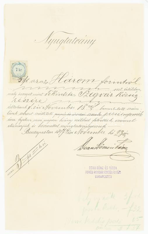 1897 Dona Döme és Társa nyugtatvány, okmánybélyeggel