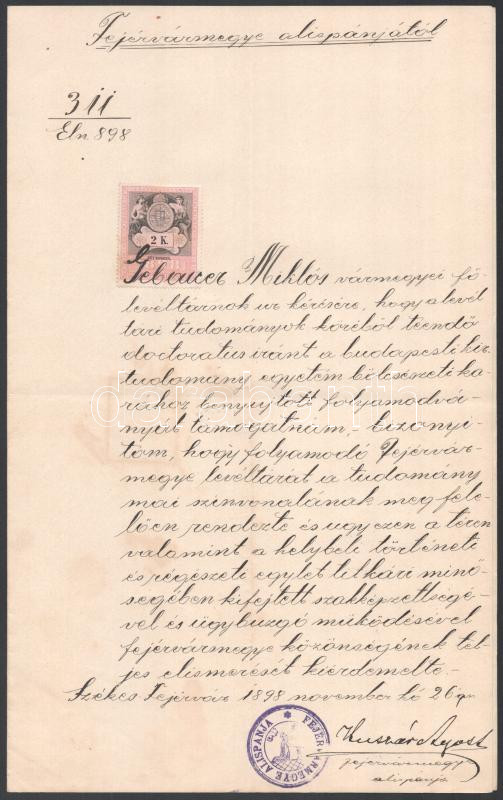 1898 Fejér vármegye alispánjának hivatalos bizonyítványa levéltáros ré...
