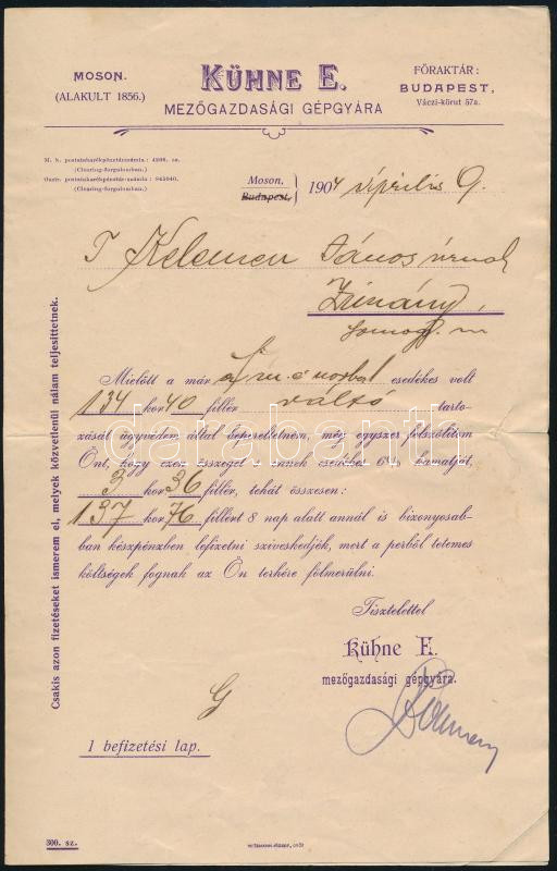 1904 Moson, Kühne E. Mezőgazdasági Gépgyára fejléces számla