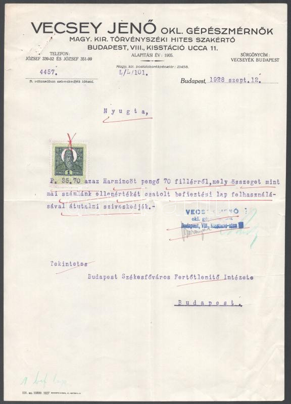1928 Bp., Vecsey Jenő okl. gépészmérnök m. kir. hites szakértő fejléces számla
