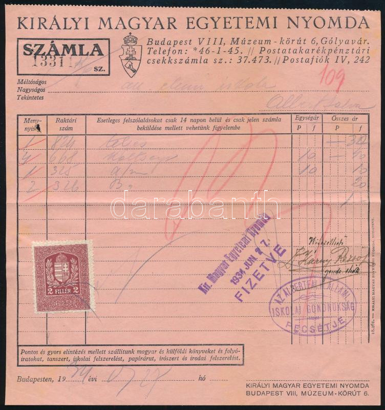 1934 Királyi Magyar Egyetemi Nyomda fejléces számla