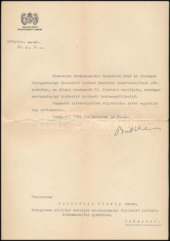 1941 Bp., Báró Bánffy Dávid miniszter, birtokos által aláírt okirat