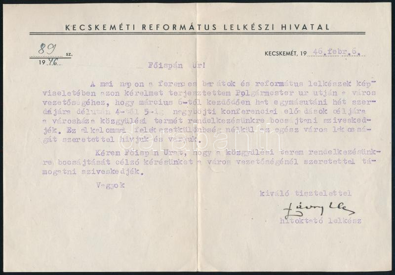 1946 Kecskemét, a Kecskeméti Református Lelkészi Hivatal kérelme a fői... https://www.darabanth.com/en/473-Online-auction/473.0/Art-and-other-collectibles/Documents~500022/1946-Kecskemet-a-Kecskemeti-Reformatus-Lelkeszi-Hivatal-kerelme-a-foispanhoz-a-varoshaza-~II3210658