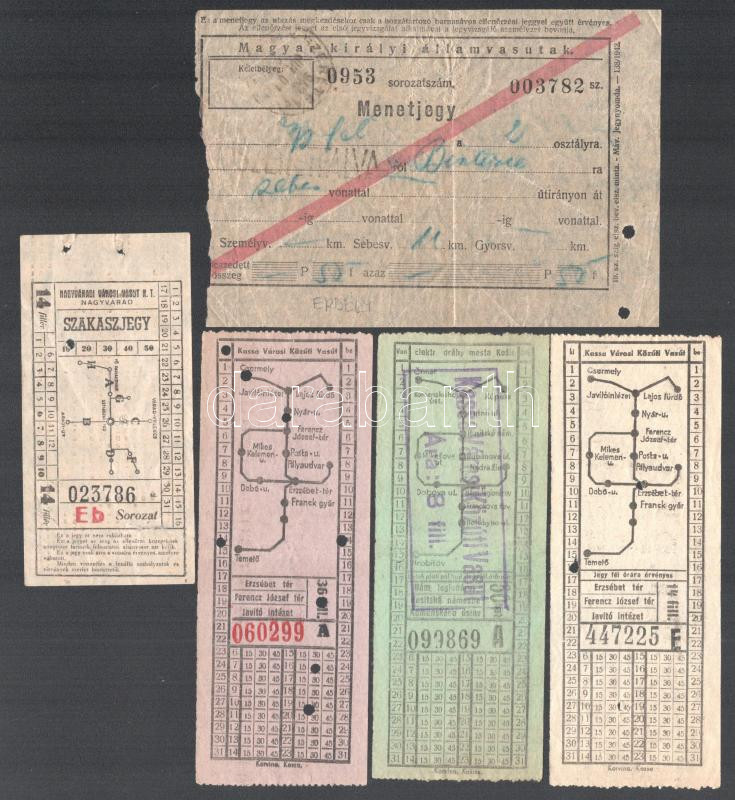 Elcsatolt magyar városok vasútjegyei: 3 db Kassa Közúti Vasút, 1 db nagyváradi városi vasút, 1 db M. Kir. Államvasutak (Szeretfalva-Beszterce)