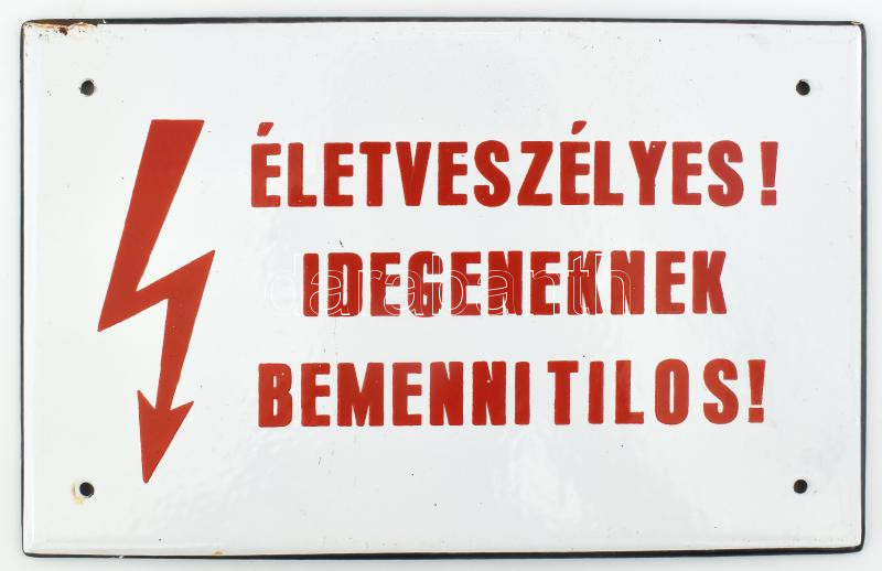 Zománcozott fém tábla, "Életveszélyes! Idegeneknek bemenni tilos! " felirattal, kis zománchibákkal, 15,5x25 cm