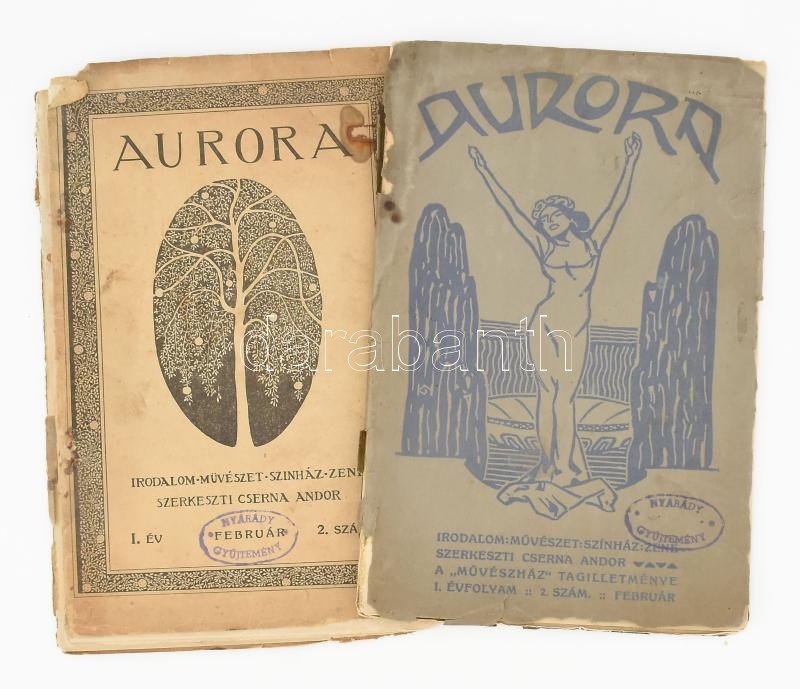 1911 Auróra. Irodalmi, művészeti, színházi és zenei folyóirat. I. évf. 2. szám, 1911. február 25. (Két példányban, különböző borítóval). Szerk.: Cserna Andor. Bp., Lengyel Lipót-ny., 53-116 p. Kiadói tűzött papírkötés, sérült, széteső állapotban, helyenként foltos.