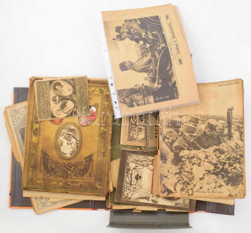 1916-1918 IV. Károly királlyal, Zita királynőével, Ottó főherceggel kapcsolatos gyűjtemény. Koronázási képes újságok, füzetek, különkiadások, Ferenc József haláláról tudósító újság különszám, Világháborús naptárak, 1916 Tolnai Világlapja koronázási emléke - A királyi pár (IV. Károly és Zita királyné). Bp., Tolnai-ny., 16 p. Egészoldalas, fekete-fehér fotókkal illusztrált. Kiadói tűzött papírkötés, stb, Egy vaskos dossziényi anyag