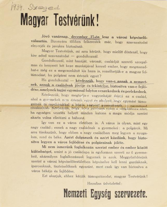 1934 Szeged, Magyar Testvérünk! A Nemzeti Egység Szervezetének felhívá...
