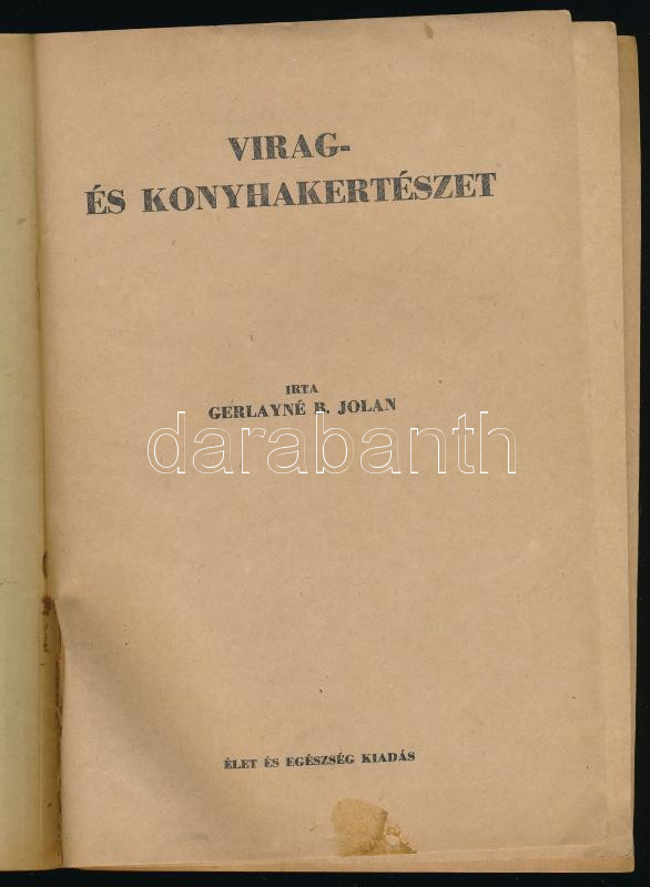 Gerlayné B. Jolán: Virág- és konyhakertészet. Bp., é.n., Élet és Egész... https://www.darabanth.com/en/473-Online-auction/473.0/Books/Books-Gastronomy-and-Gardening~1000023/Gerlayne-B-Jolan-Virag-es-konyhakerteszet-Bp-en-Elet-es-Egeszseg-Kiadoi-papirk~II3211389