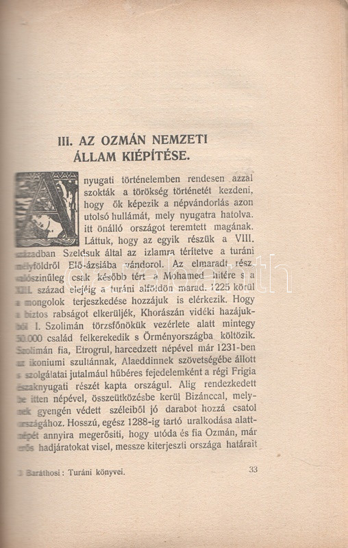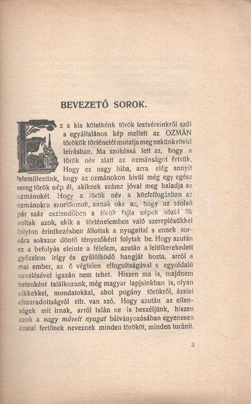 Baráthosi Balogh Benedek: Vázlatok török testvéreink történetéből. Budapest, 1928. Szerző - Held Irodalmi és Nyomdavállalat. 159 + [1] p. Első kiadás. Baráthosi-Balogh Benedek (1870-1945) néprajzkutató, Ázsia-utazó, őstörténeti író. 1908-tól több alkalommal bejárta Kelet- és Közép-Ázsia számos táját, mindannyiszor a magyarság turáni kapcsolatait kutatva. 1926-ban megkezdett turáni könyvsorozatával a rokonnak tartott népek történetét, erkölcseit, életmódját mutatta be. Kötetünkben a türk népek vezető erejét az oszmán törökség történetét részletezi, szenvedélyes hangon, szokatlan látószögből: a szerző elsősorban amellett érvel, hogy a törökség kulturálisan és morális szempontból akkor is felette áll a művelt nyugatnak, ha a szokásos nyugati narratíva ennek az ellenkezőjéről számol be, a valódi barbárság ugyanis a másik kifosztásában és lenézésében gyökeredzik, amelyben a nyugat elavulhatatlan érdemeket szerzett és szerez. Mindez különösen annak fényében érdekes, hogy a szerzőnek a törökellenes háborúk korát nagy terjedelemben kell áttekintenie; ezeket az időket elsősorban a harmadik utat kereső Erdélyi Fejedelemség látószögéből tekinti át. Baráthosi Balogh Benedek az Oszmán Birodalom szembetűnő politikai hanyatlását a régi török erkölcsök megkopásához, illetve a Nyugat sikeres zsákmányszerző attitűdjéhez köti. A kötet értékesítéséből származó jövedelmet kötetünk hátsó borítójának tájékoztatása szerint a szerző az erdélyi magyar iskolák segélyezését szervező alapítványnak szánta. (Baráthosi turáni könyvei. 5. kötet.) Fűzve, illusztrált, zsinórral erősített, javított gerincű, enyhén sérült kiadói borítóban. Körülvágatlan példány.