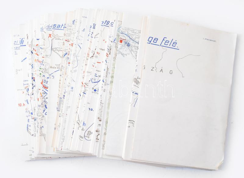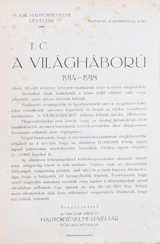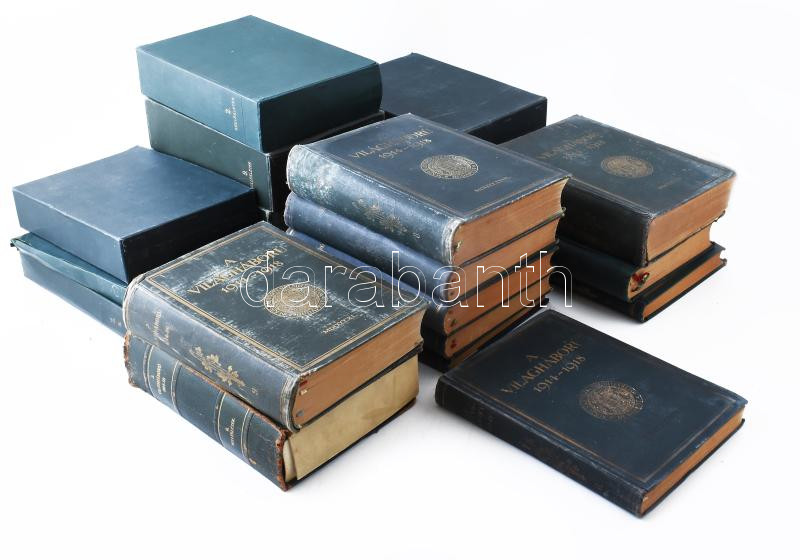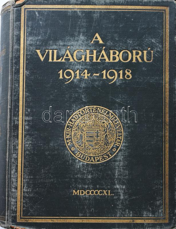 A világháború 1914-1918. Különös tekintettel Magyarország és a magyar csapatok szereplésére. Szerk. és kiadja a M. Kir. Hadtörténelmi Levéltár. I-X. köt. [Teljes! A mellékletek között néhány hiánnyal, lásd lentebb.] Bp., 1928-1942, Stádium-ny. Kiadói egységes, aranyozott egészvászon-kötésben, változó, többségében jó állapotban, részben kopott borítókkal. A térképek és mellékletek eredeti, kiadói tékákban (az egyik tok sérült). I. köt.: Külpolitikai visszapillantás. A világháború kitörése. Események az orosz hadszíntéren 1914. évi augusztus hó 20-ig. (239 p. + 6 db melléklet a kötet végén). II. köt.: Az orosz harctéren lefolyt események 1914. augusztus 30-ig. (562 p. + 20 db melléklet + 1 füzet). III. köt.: Az 1914. évi galíciai bevezető nyári hadjárat; [...] Események a nyugati hadszíntéren a háború kitörésétől 1914. szeptember közepéig. (666 p. + 8 db melléklet + 1 füzet). IV. köt.: Az Osztrák-Magyar Monarchia 1914. évi augusztusi Szerbia és Montenegro elleni hadjárata. (413 p. + 9 db melléklet [+ füzet hiány!]). V. köt.: Az Osztrák-Magyar Monarchia 1914. évi szeptember-decemberi szerbiai és Montenegro elleni hadjárata. (712 p. + 12 db melléklet + 1 füzet). VI. köt.: 1914. szeptember második felének és október havának eseményei a keleti (orosz) és a nyugati (francia) hadszíntéren. (453 p. + 40 db melléklet). VII. köt.: 1914. november és december havának eseményei. (700 p. + 30 db melléklet + 1 táblázat). VIII. köt.: 1915. első négy havának eseményei. (919 p. + 28 db melléklet). IX. köt.: 1915. május és junius havának eseményei. (825 p. + 75 db melléklet [51. sz. melléklet hiány!]). X. köt.: Az 1915. évi nyári események. (949 p. + 57 db melléklet [43. sz. melléklet hiány!] + 1 füzet). Az I. világháború eseményeit a háború kitörésétől 1915. augusztusáig feldolgozó, 10 kötetből álló mű a Hadtörténelmi Levéltár legnagyobb szabású vállalkozása volt megalakulása óta. A tíz megjelent kötet kiadása 1928-tól 1942-ig tartott. (A teljes művet eredetileg 20-25 kötetre tervezték.) Az első kötet előszavában Gerbert Károly főigazgató a munkát a Hadtörténelmi Levéltár ,,hivatalos világháborús művének" nevezi. A kötetek összeállításában és szerkesztésében részt vett többek között Madarász László, az irodalmi osztály főelőadója, valamint Kárpáthy Ákos ny. áll. tábornok is.