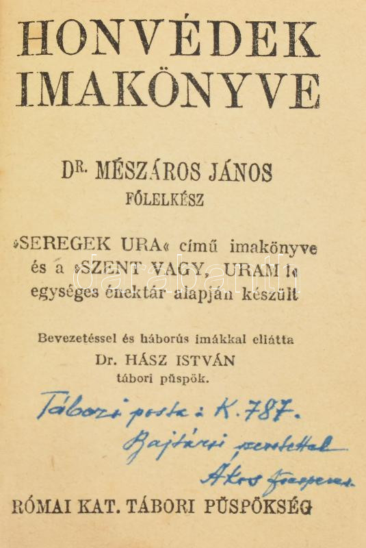 Description: Mészáros János: Honvédek imakönyve. Dr. - - főlelkész. Bevezetéssel, és háborús imákkal ellátta: Dr. Hász István tábori püspök. hn., (1942.), Római Katolikus Tábori Püspökség. Kiadói egészvászon-kötés, kopott, kissé sérült kartontokban, ajándékozási sorokkal (Bajtársi szeretettel Ákos főesperes.)