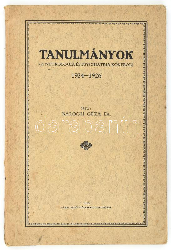Dr. Balogh Géza: Tanulmányok a neurologia és a psychiatria köréből 1924-1926. 1926, Pápai Ernő Műintézete, papírkötés.