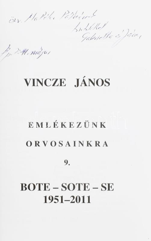 Vincze János: Emlékezzünk orvosainkra 9. BOTE - SOTE - SE 1950-2011. Szerk.: Vincze - Tiszay Gabriella. A kötet szerzője, Vincze János, és szerkesztője, Vincze - Tiszay Gabriella által DEDIKÁLT példány. Bp., 2011., NDP. Kiadói papírkötés.